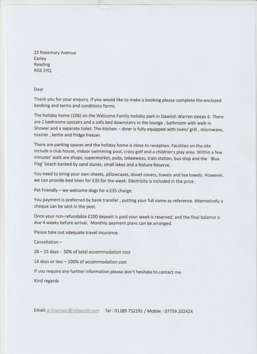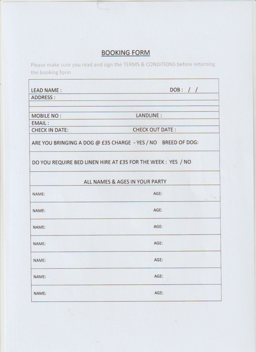 Thank you for your enquiry. If you would like to make a booking please complete the enclosed booking and terms and conditions forms.
